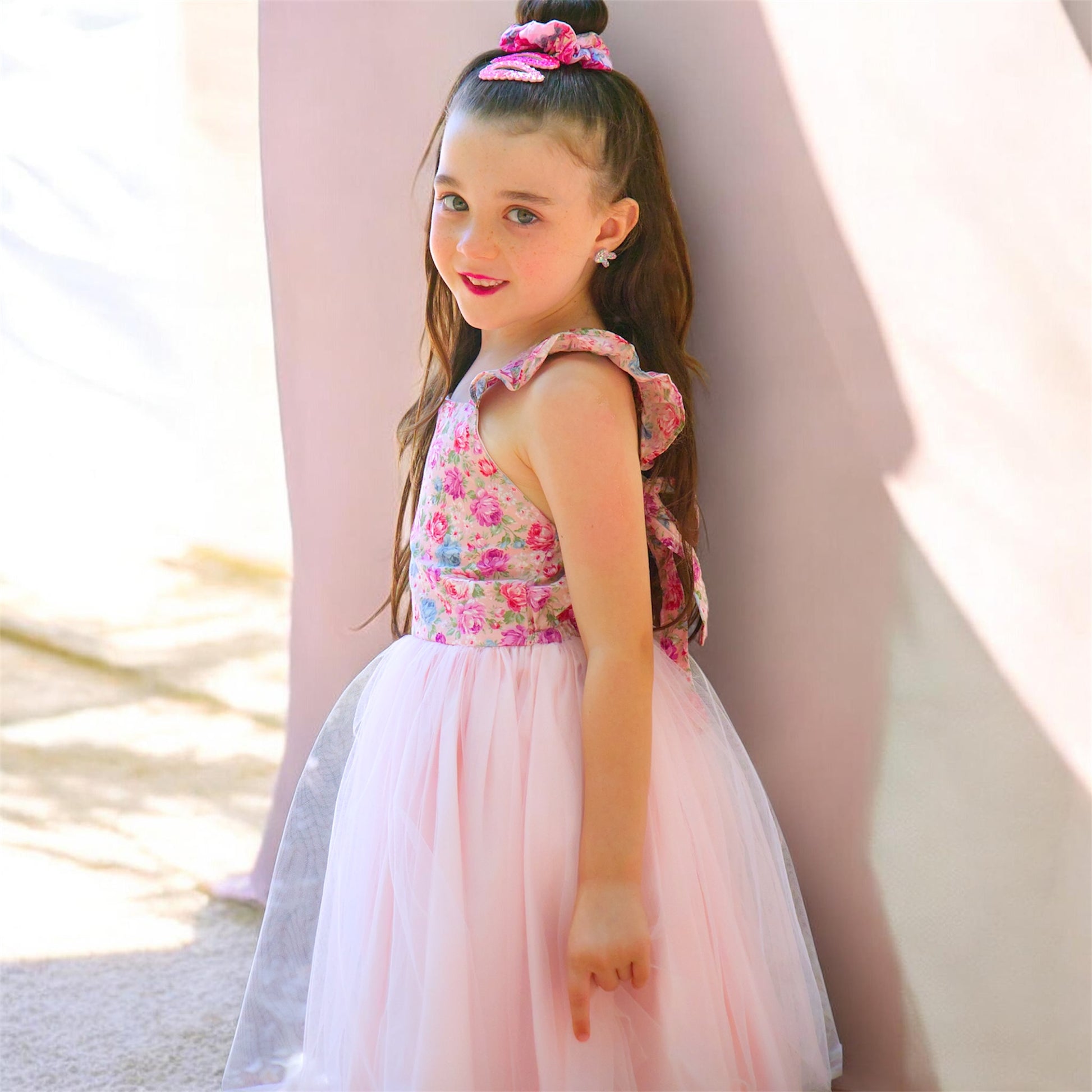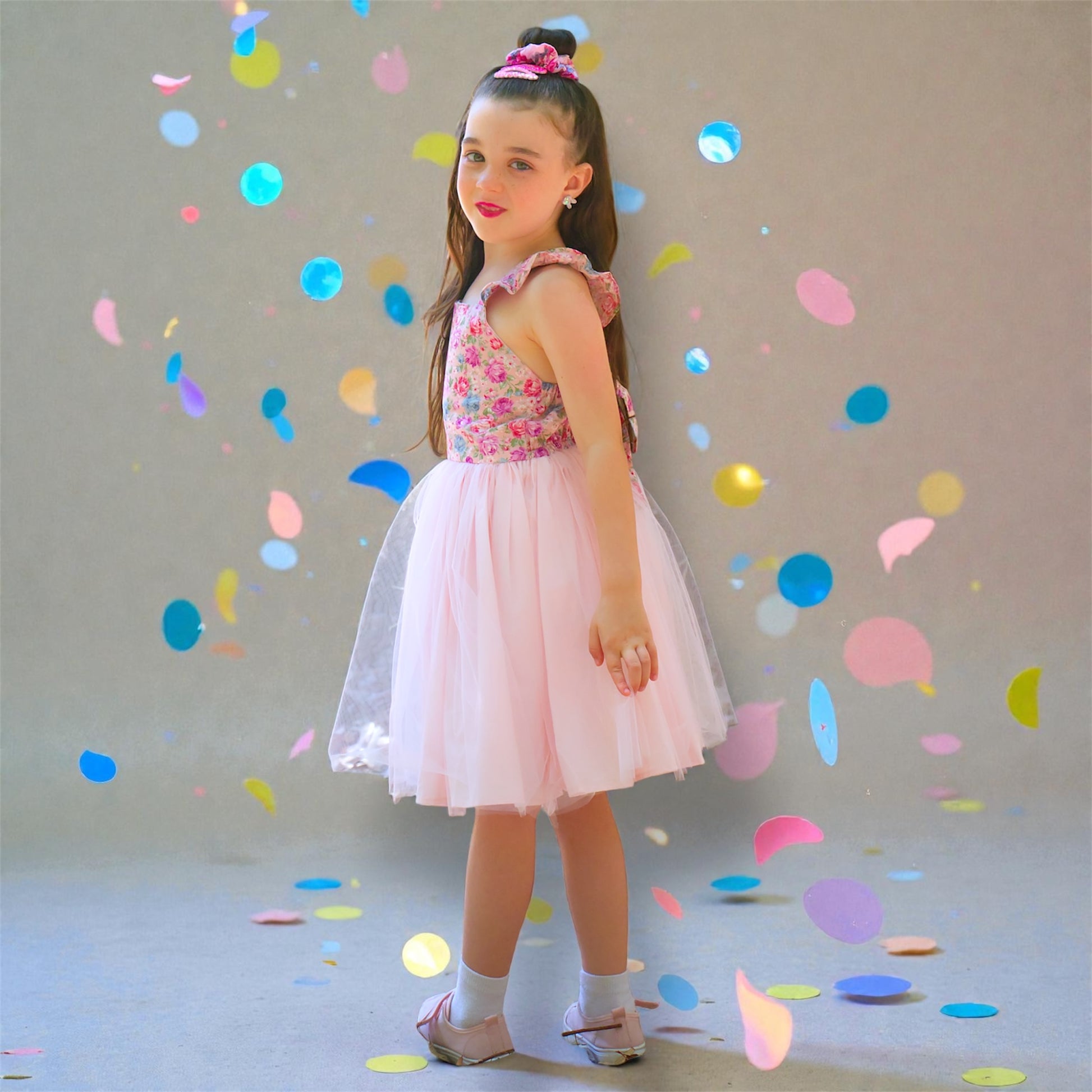 The skirt is layered with soft, light pink tulle — creating beautiful volume and movement — and fully lined with cotton for comfort against delicate skin. The cotton lining perfectly complements the floral bodice, making this dress as practical as it is beautiful.