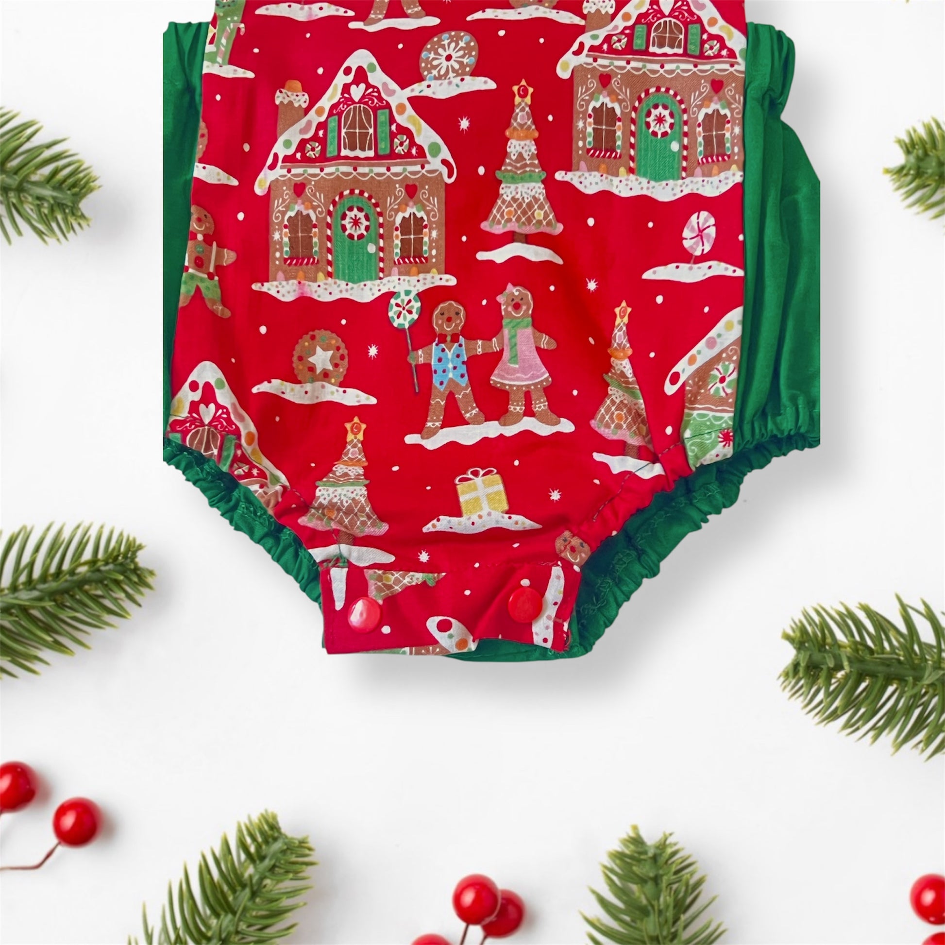 Get your little one ready for the holidays with this adorable gingerbread-themed romper from Elfin Kidz! Made from 100% soft cotton, this comfy romper features a festive print with gingerbread houses, gingerbread men, candy, and Christmas trees. It has adjustable crisscross straps at the back, poppers at the bottom for easy changes, and elastic around the leg openings for maximum comfort. Perfect for Christmas festivities and a sweet gift for any little one!