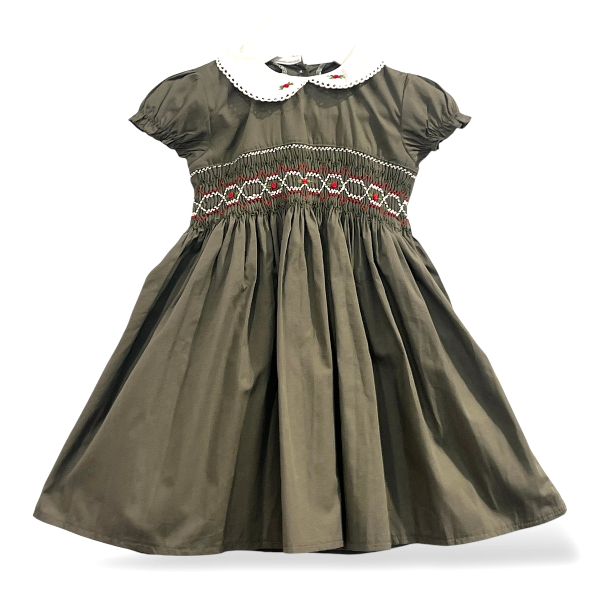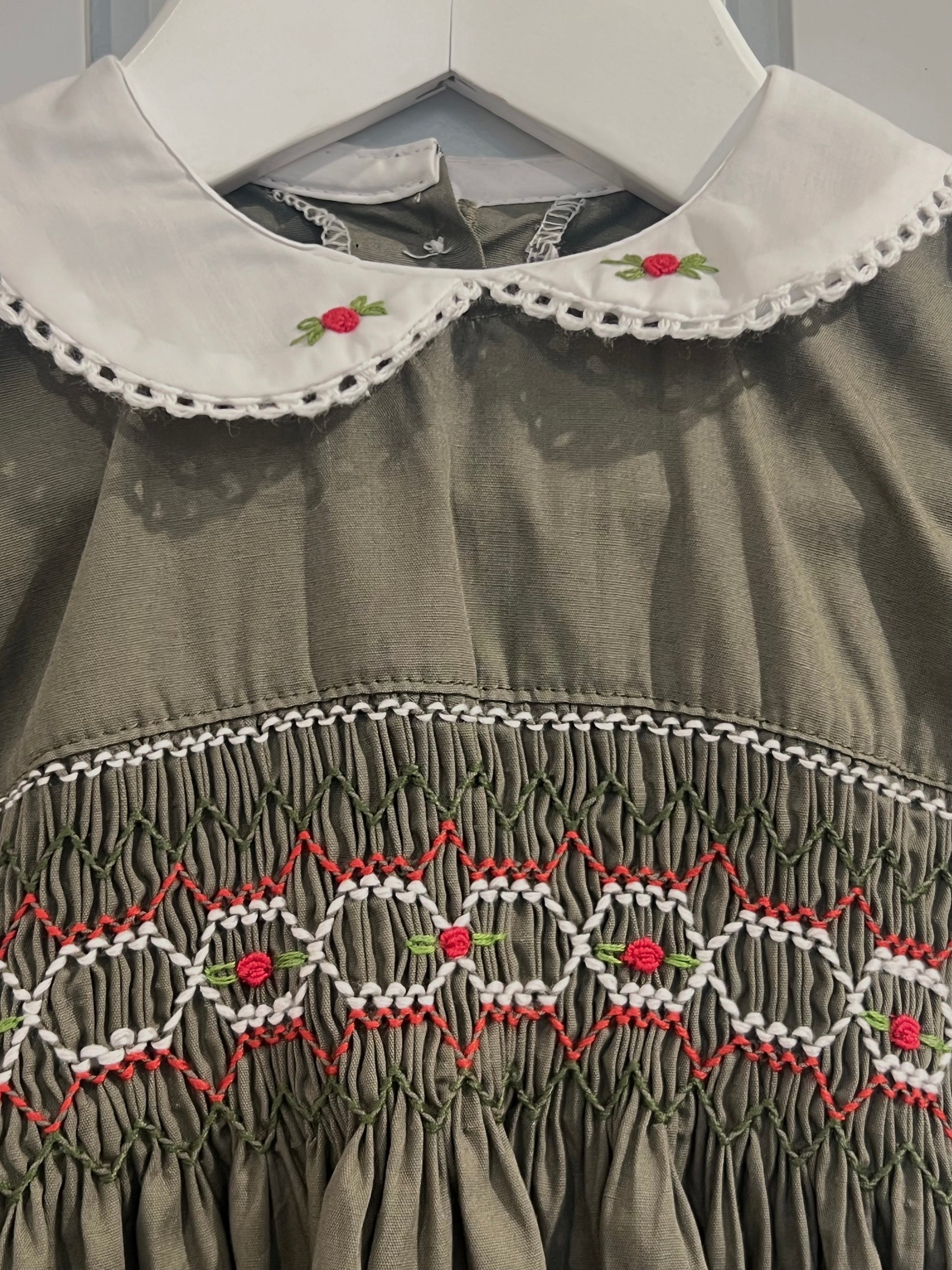 This beautifully hand-smocked olive green dress features intricate red and white embroidery across the chest, showcasing timeless craftsmanship. Designed with puff sleeves and a crisp white Peter Pan collar edged in delicate trim, it adds a touch of elegance to everyday charm. A belly tie at the back ensures an adjustable fit, while button closures along the back offer ease and comfort. Made from 100% cotton, this dress is soft, breathable, and ideal for all-day wear. Perfect for special occasions or styled for play, it’s a versatile wardrobe piece with heirloom appeal.