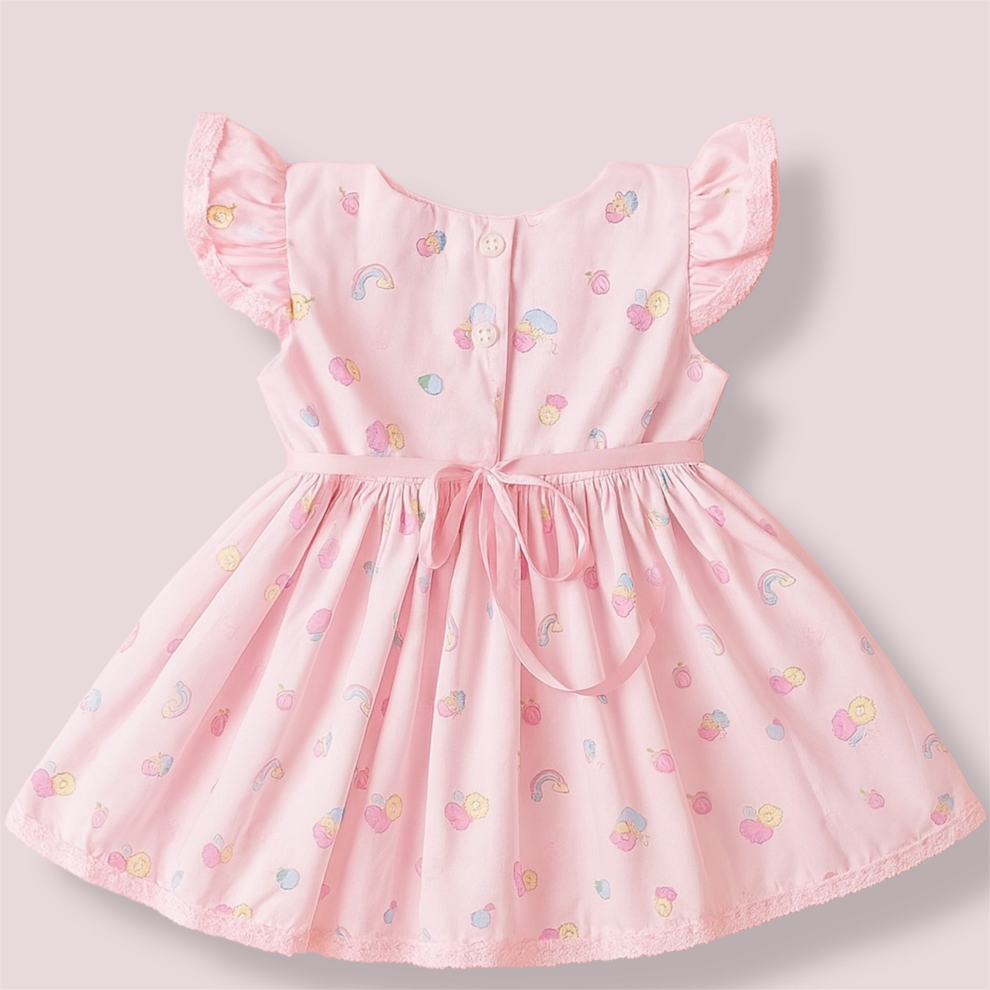 Dress your little one in absolute sweetness with our 100% Cotton Pastel Pink Flutter Sleeve Dress, designed for everyday comfort and adorable charm. Made from soft, breathable cotton, this dress features a full gathered skirt for a lovely twirl, delicate flutter sleeves with lace trim, and a playful pastel print of rainbows, clouds, hearts, and treats.