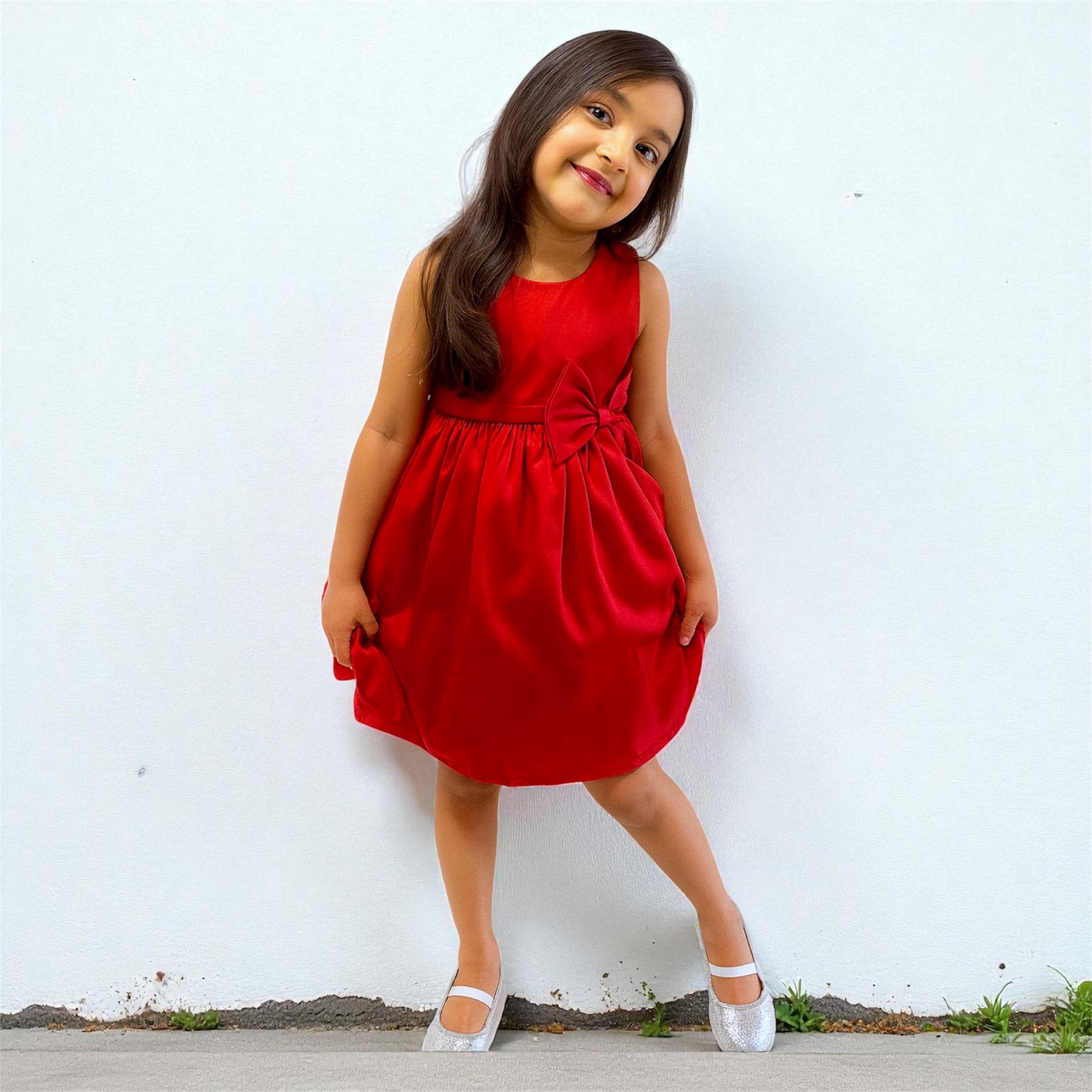 Give your little one a touch of elegance with our luxury Red Satin Bow Dress, beautifully crafted for special occasions. Made from premium satin fabric, this stunning dress features a classic sleeveless design and a statement bow at the waist, creating a timeless and graceful silhouette.