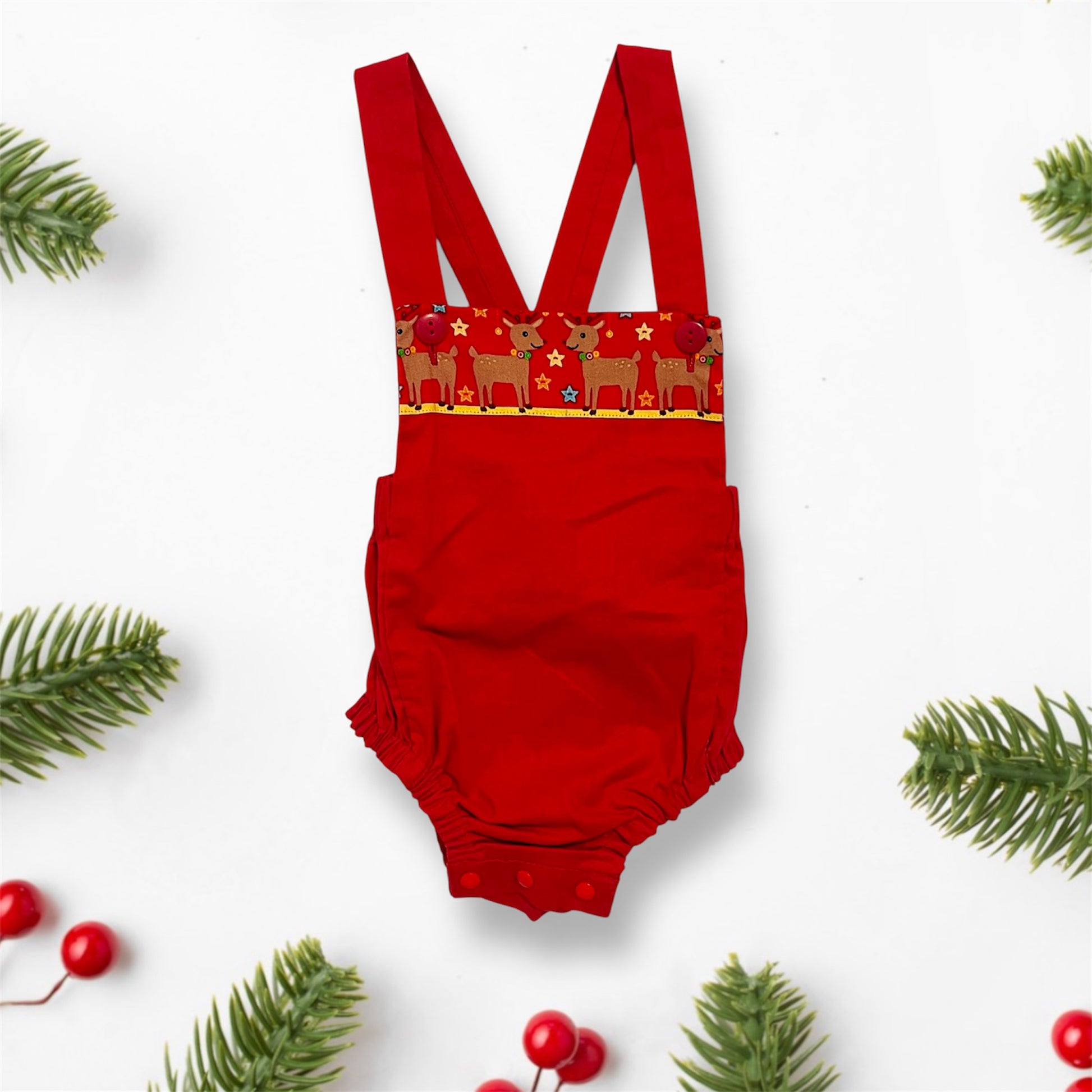 Celebrate the festive season in style with our adorable red cotton Christmas romper! This charming romper features adjustable crisscross straps that fasten with buttons for a perfect fit. The elasticized leg openings and back ensure comfort and ease of movement. Adorned with cute reindeer appliqués on the front, this solid red romper is perfect for holiday gatherings. Made from 100% soft cotton, it’s gentle on your little one’s skin. Available now at Elfin Kidz!